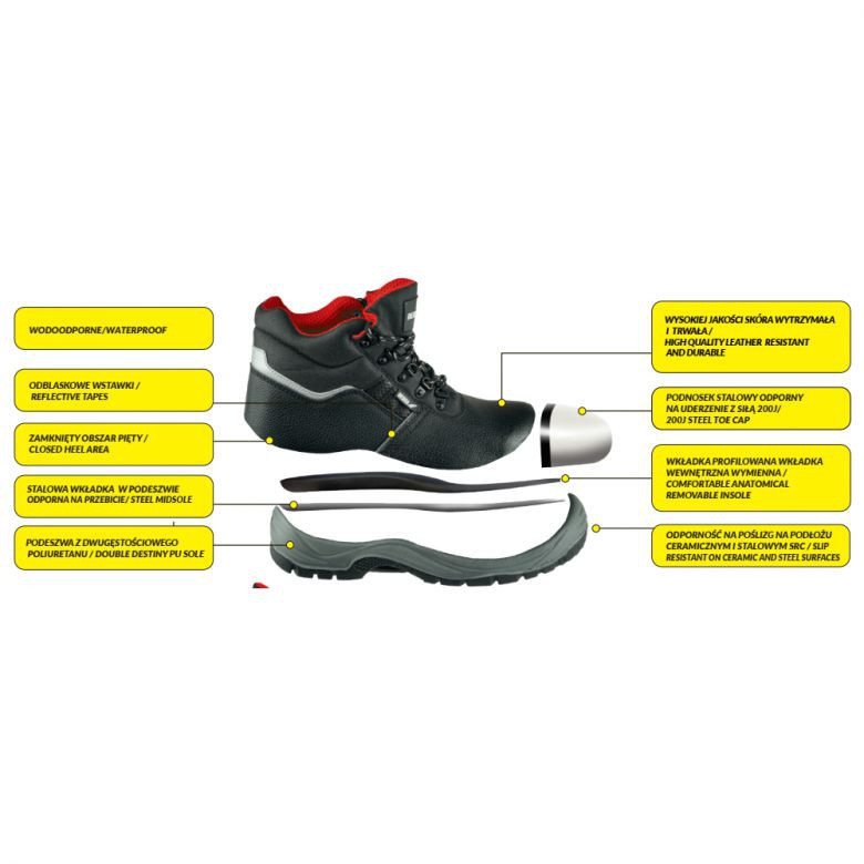 Vízálló, Acél középtalp, kíváló minőségű bőr felsőrész, csúszásbiztos talp kerámia és acél felületen, acél orrvédő (200J)Anyag: marhabőr; CE tanúsítvány; EN ISO 20345:2022 szabvány; kettős sűrűségű PU/PU talp; acél talpbetét; acél középtalp; elektrosztatikus/olajálló talp.