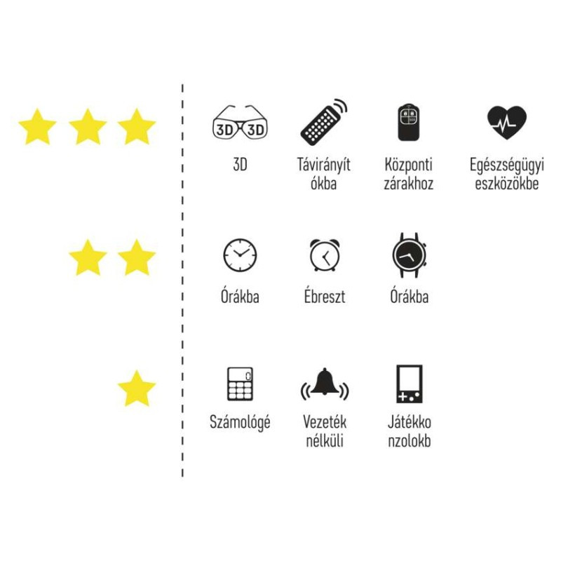 * Felhasználás: Karórák, számológépek, kamerák, orvosi implantátumok, autók kulcsainak távirányítói, vészvilágítások.