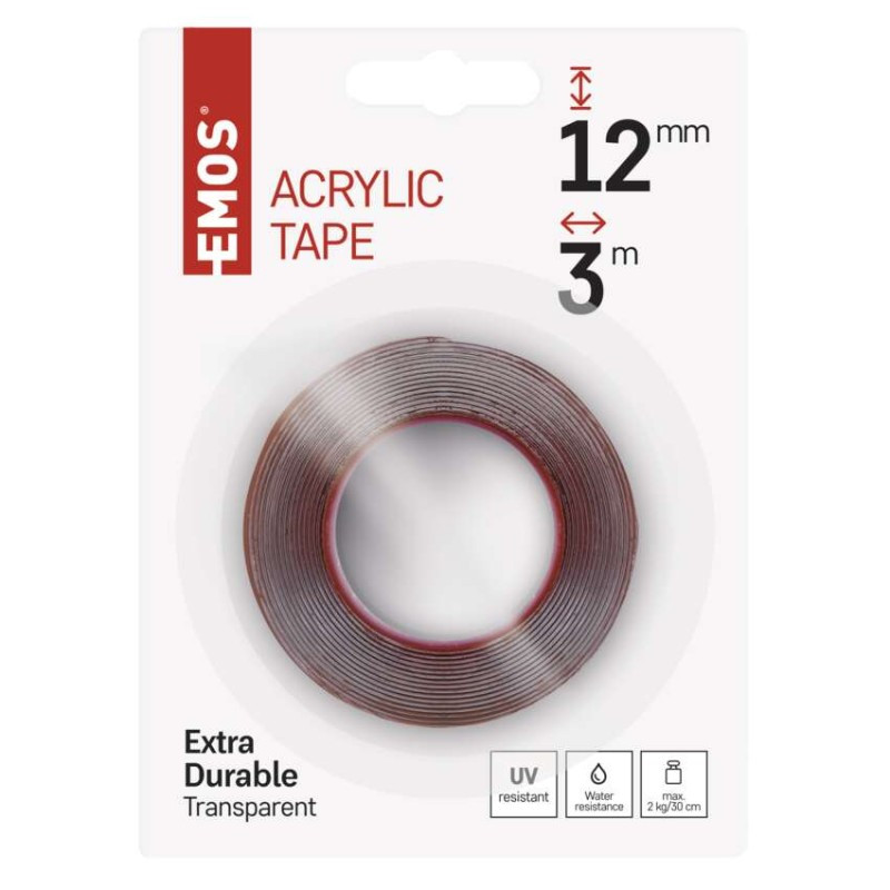 Univerzális, átlátszó, kétoldalas szalag, szélesség12 mm és 3 méter tekercshossz, 100%-ban akrilból készült. Az rendkívüli rugalmasságának, extrém tapadásának és ellenállóságának köszönhetően tökéletesen tapad minden felületi egyenetlenséghez.