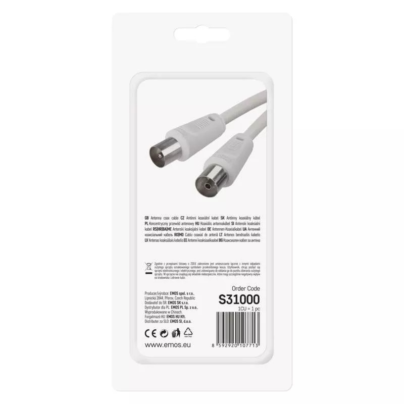 Koaxiális antennakábel IEC csatlakozódugóval és csatlakozóhüvellyel. A kábel kettős árnyékolású az elektromágneses interferencia csökkentése érdekében. 10 m-es kábelhossz.