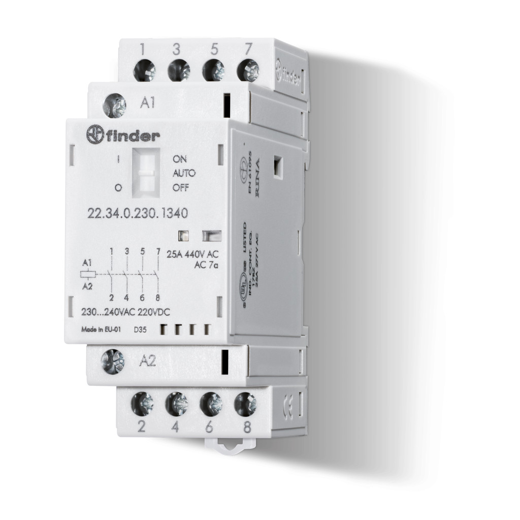 Modular contactors Contacts configuration: 2NO + 2NC Contact Material: AgNi Rated operating voltage: 250 V. Max. incandescent lamp load: 800 W. Max. load fluorescent lamp: 200 VA. Voltage type (excitation voltage): AC/DC Rated excitation voltage: from 176 to 264 V. Voltage type (operating voltage): AC Rated operation current: 25 A. Additional equipment possible: yes Protection Category: IP 20 Options: Mechanical indicator + LED Accessories: Adaptor for panel mounting;jumper link