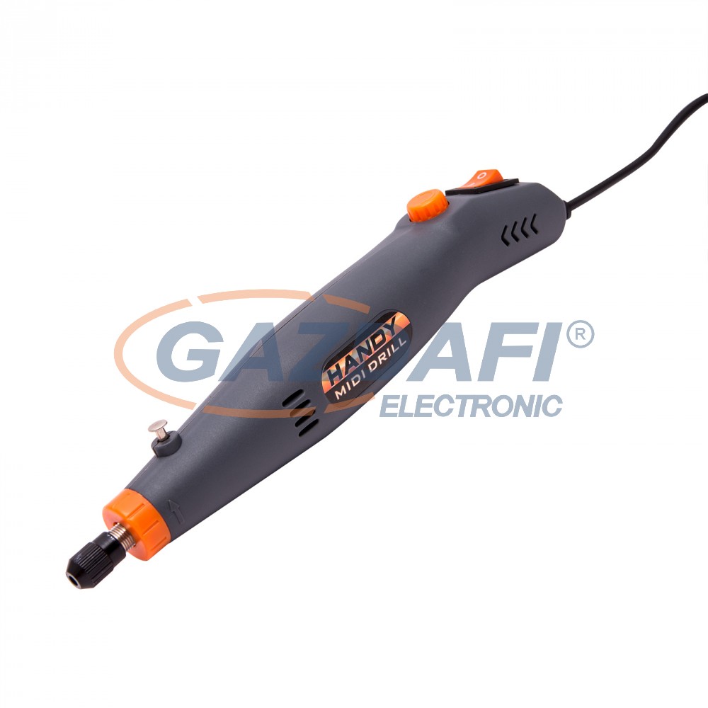 A HANDY DRILL csiszoló, gravírozó és fúrógép kifejezetten otthoni, manikűr/pedikűr és barkács célra lett kifejlesztve. Segítségével kisebb furatokat készíthet, csiszolhat, polírozhat, gravírozhat vagy akár vághat. Maximális furat befogadó képessége Ø3,2 mm. A különféle kiegészítők egyszerűen csatlakoztathatók.