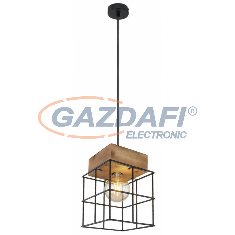 Függeszték világosbarna fa alaplap, fekete acél háló búrával. HxSzxM: 200x200x1500, fényforrás nélkül 1xE27 60W 230V