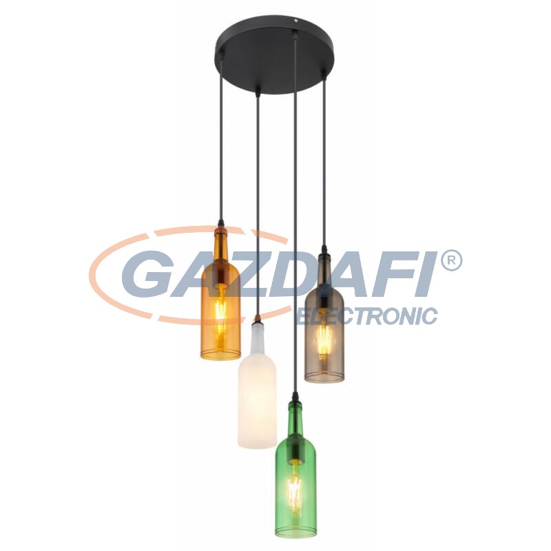 Függeszték fém fekete váz, akril tarka búrákkal. (opál,zöld,borostyán, füstszínű) Ø:380, H:1180, fényforrás nélkül 4xE27 LED 8W 230V
