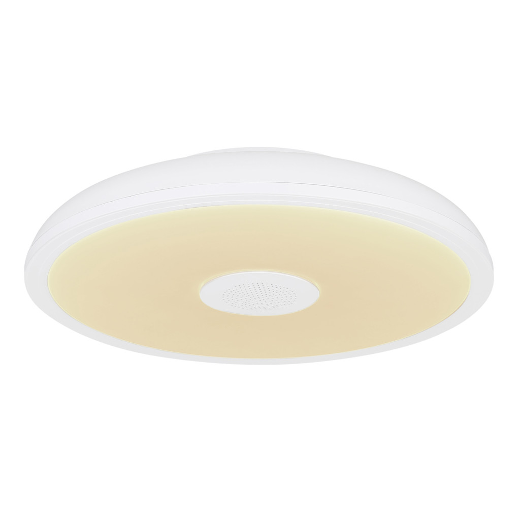 Mennyezeti műanyag fehér váz, opál akril búra csillogó effekttel. Funkciók:éjjeli fény, fényerőszab,,memória,színhőmérsékletvált, távirányító, Bluetooth-on keresztül zenelejátszó, színváltós. Ø:280,M:55,LED 18W 1000lm,RGB LED 3W,CCT2700-6500, IP44