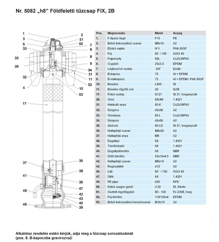 - Öntvényrészek gömbgrafitos öntöttvasból, epoxi porbevonattal; oszlop tűzihorganyzott acélcsőből; különleges lakkbevonattal; dugattyú és egyéb alkatrészek korrózióálló anyagokból