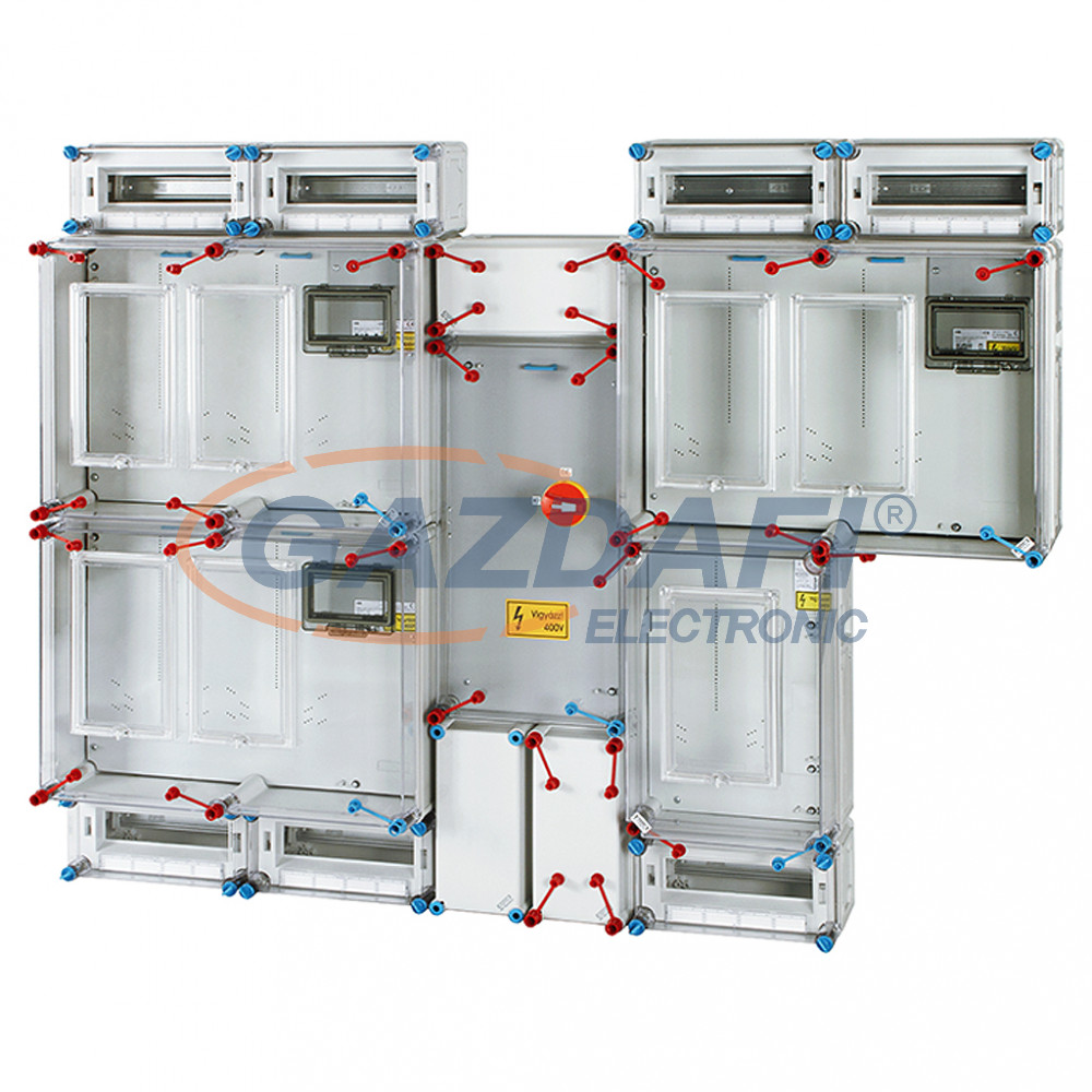 HENSEL HCS432+1+MF Csoportos mérőhely, három fogyasztó rész. mindennapszaki (80A) és vezérelt (32A)/H-tarifa (63A)méréshez,kapcsolóval és NH 00 szakaszolható bizt.aljzattal,túlfesz. levezetőhöz előkész.,közösségi méréssel,fogyasztói főelosztóval