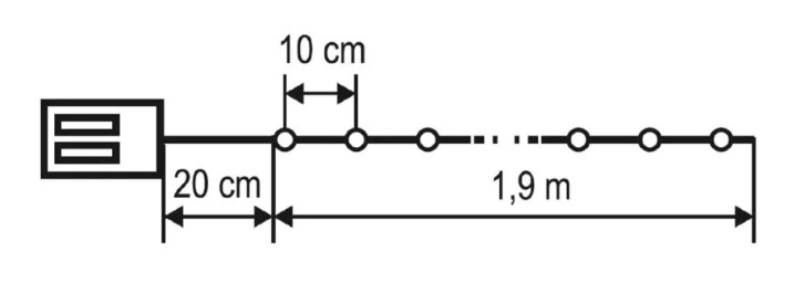 A fényesen ragyogó, pontszerű LED-ek 10 cm távolságra helyezkednek el egymástól, biztosítva, hogy a fények egyenletesen oszoljanak el a füzér teljes hosszán. A fényfüzér tápellátása 2 db 1,5 V-os (AA) elemmel történik, amely nem tartozék, de egyszerűen beszerezhető, így a füzér könnyedén elhelyezhető bárhol a lakásban, anélkül, hogy elektromos csatlakozóra lenne szükség.