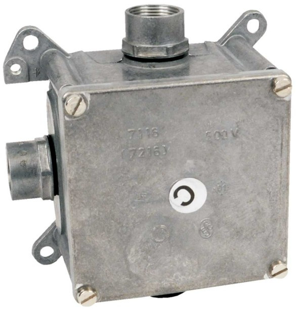 7116 B - Metal box with IP protection, configuration P16,metal colour, package - 1/12 pcs - boxes for piping with steel threaded or metal flexible pipes, three glands and one dowel evenly distributed on the sides of the box, terminal plate is not a part of the box, fitted with a clamp for installation in TNS networks