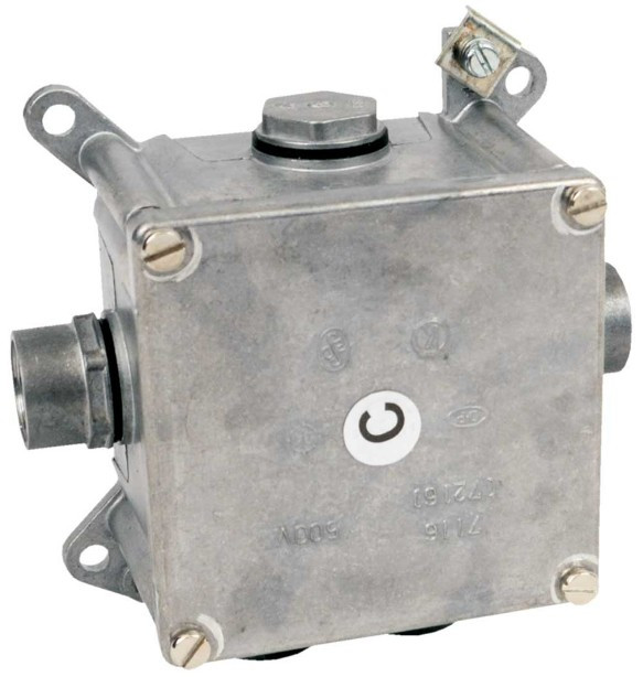 Wiring distribution box from aluminium alloy. Outlets are adjusted for metal pipes distribution system with thread M20