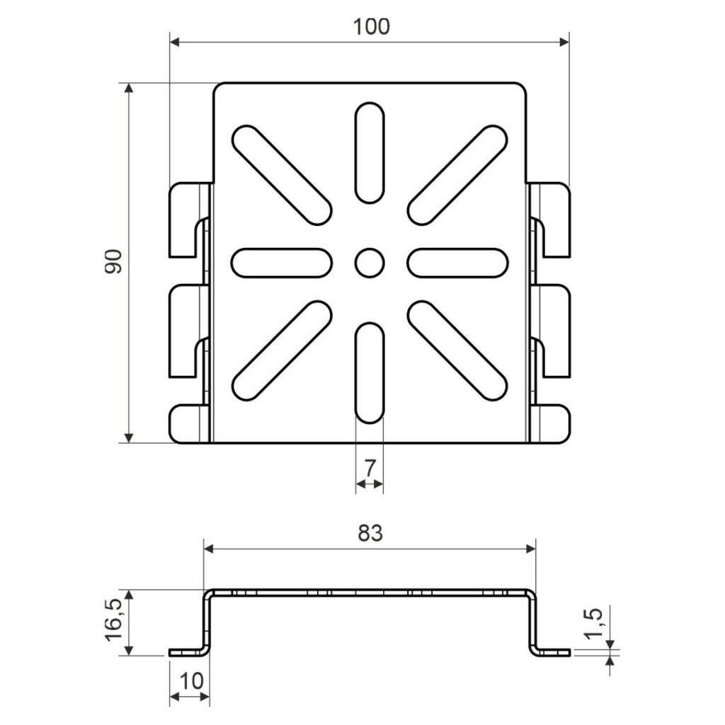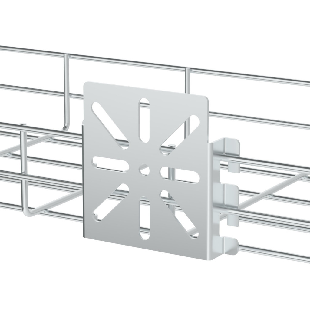 Mounting plate for installation on wire trays, suitable for placing wiring boxes on the sides of wire cable gutters, for easy creation of branching of cable ducts on cable routes. Surface finish - Magnelis®