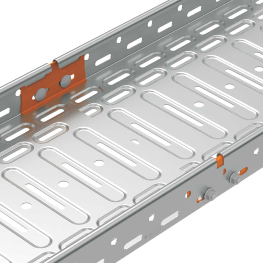 Coupling is designed for cable trays with a sidewall height of 100 mm in a location without an integrated coupling. ZM surface finish (galvanizing Zn+Al+Mg) is intended for products with ZM surface finish or hot-dip galvanized products.