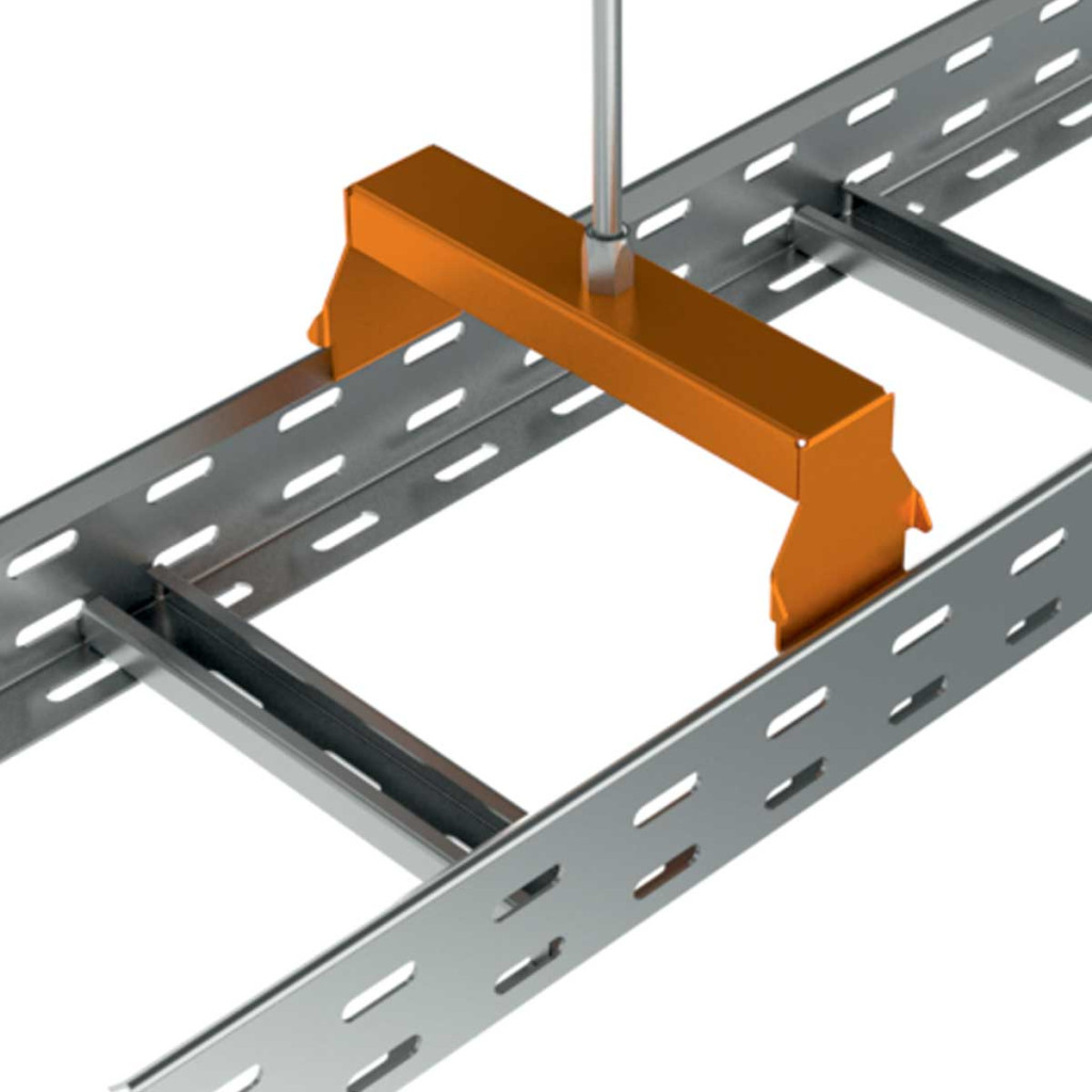 Hanger for suspending cable routes by threaded rod from ceiling. Easy assembly by suspending with bent edges of the sidewalls of cable routes with sideboard height 200 mm, suitable for hot dip galvanized cable routes