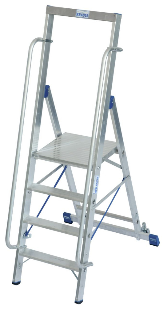 Gurítható lépcsőfokos állólétra nagy, kényelmes állófelülettel és biztonsági kapaszkodókerettel.