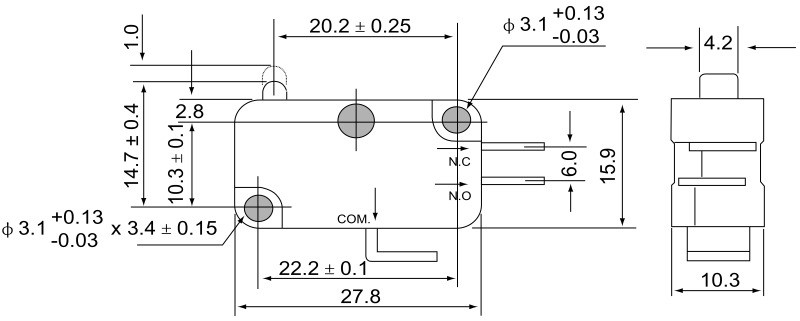 TRACON KW3-05 Helyzetkapcsoló, mikro, ütközős 1×CO 10A/230VAC, 0,3A/250VDC, 4,8x0,5 mm, IP00