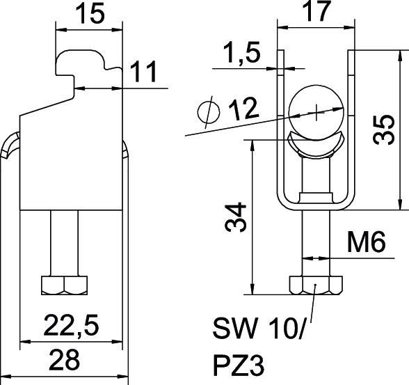 Kengyeles bilincs N-kivitel, a fém nyomóvályú legömbölyített peremmel rendelkezik, így nem kell tartani a kábel sérülésétől. Függőleges és vízszintes szereléshez 1 kábel részére C profilsínen. Résszélesség 11 - 12 mm. Egymenetes csavar a nyomóvályún, univerzális hatlapfejű csavarfej SW10/PZ3, kereszthoronnyal. Kültéri és beltéri szereléshez alkalmas. Ellendarab használata ajánlott.