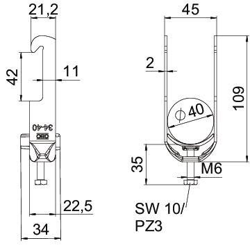Kengyeles bilincs W-kivitel, polipropilén műanyag nyomóvályúval. Függőleges és vízszintes szereléshez 1 kábel részére, 40 mm oldalmagasságú szögvashoz. Egymenetes csavar a nyomóvályún, univerzális hatlapfejű csavarfej SW10/PZ3 kereszthoronnyal. Kültéri és beltéri szereléshez alkalmas. Ellendarab használata ajánlott.