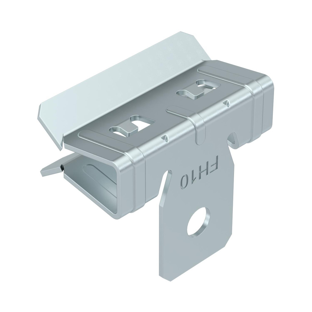 Support clamp with drill hole for individual mounting solutions, e.g. to accept S hooks or chains. Fastening through knocking onto steel girders.