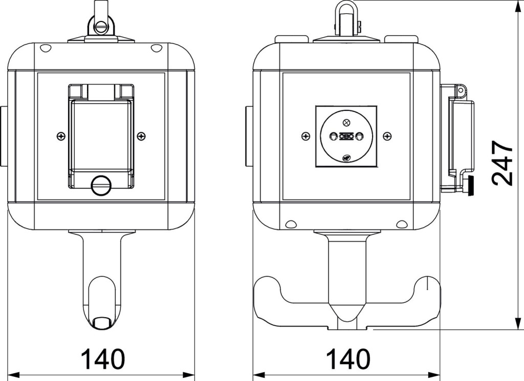2 db egyes csatlakozóaljzat, 16 A/250 V, megnövelt érintésvédelemmel, az egyik váltakozó áramú körben előre huzalozott, csatlakozás 1 db 3 pólusú sorkapocs blokkon keresztül, elválasztófallal az áramkörök szétválasztásához és FI/LS relével.