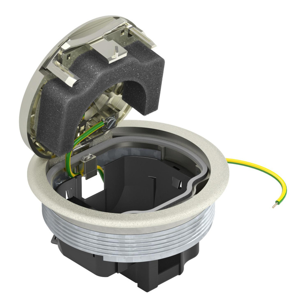 Kerek beépítőegység padlóburkolat-védőkerettel, az UDL2-120 típusú szerelvénydobozba történő közvetlen beépítéshez, beltéren. Zárt állapotban a beépítőegységek nedvesen is ápolhatóak. A minimális beépítési mélység 70 mm.