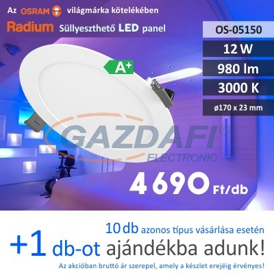 RADIUM Süllyesztett LED panel, kerek, 12W, 980Lm, 3000K 17x23mm