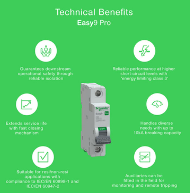 Az Easy9 Pro, az Easy9 család legújabb tagja, a legmagasabb szintű elektromos védelmet nyújtja, miközben megfelel a különböző projektek követelményeinek. Ideális lakossági környezetben, valamint kis- és közepes kereskedelmi épületekhez (pl. éttermek, gyógyszertárak, élelmiszerboltok, kiskereskedelmi üzletek).