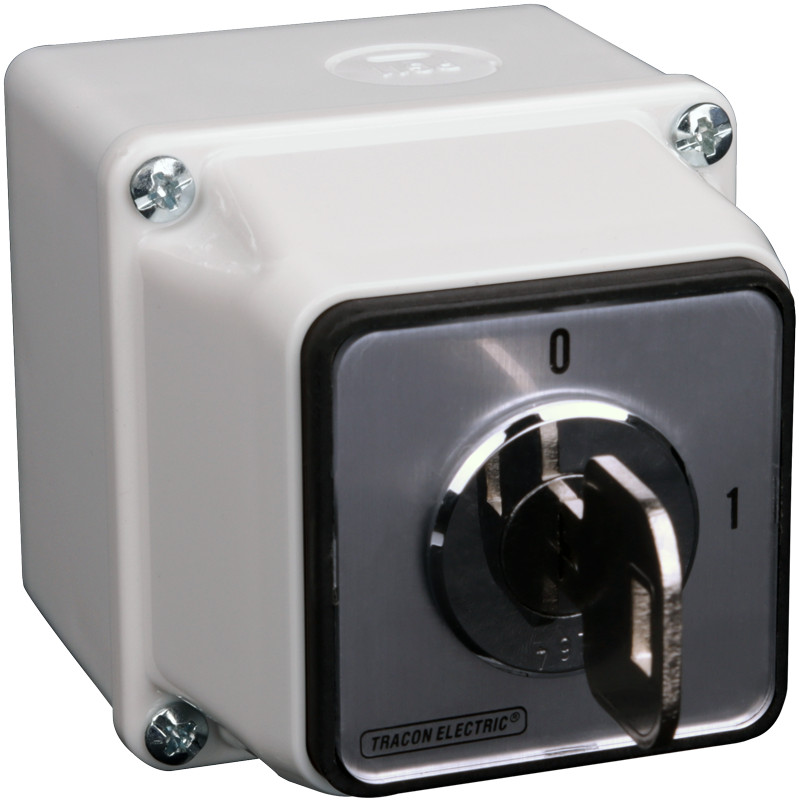 TRACON TKFK-20T Tokozott főkapcsoló, kulcsos, BE-KI (Kulcs 0-áll. kivehető) 400V, 50Hz, 20A, 4P, 5,5kW, 48×48mm, IP44