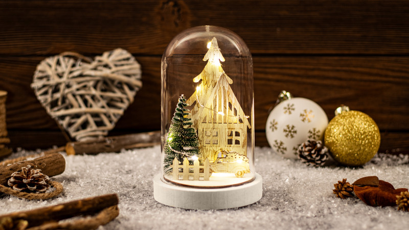 TRACON CHRHB10WW LED karácsonyi házikó burában,fa, elemes (X24016) Timer 6+18h, 10LED, 3000K, 2xAAA