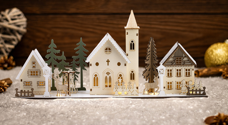 TRACON CHRVILC10WW LED karácsonyi falu, fa, elemes (X24004) Timer 6+18h, 10LED, 3000K, 2xAA