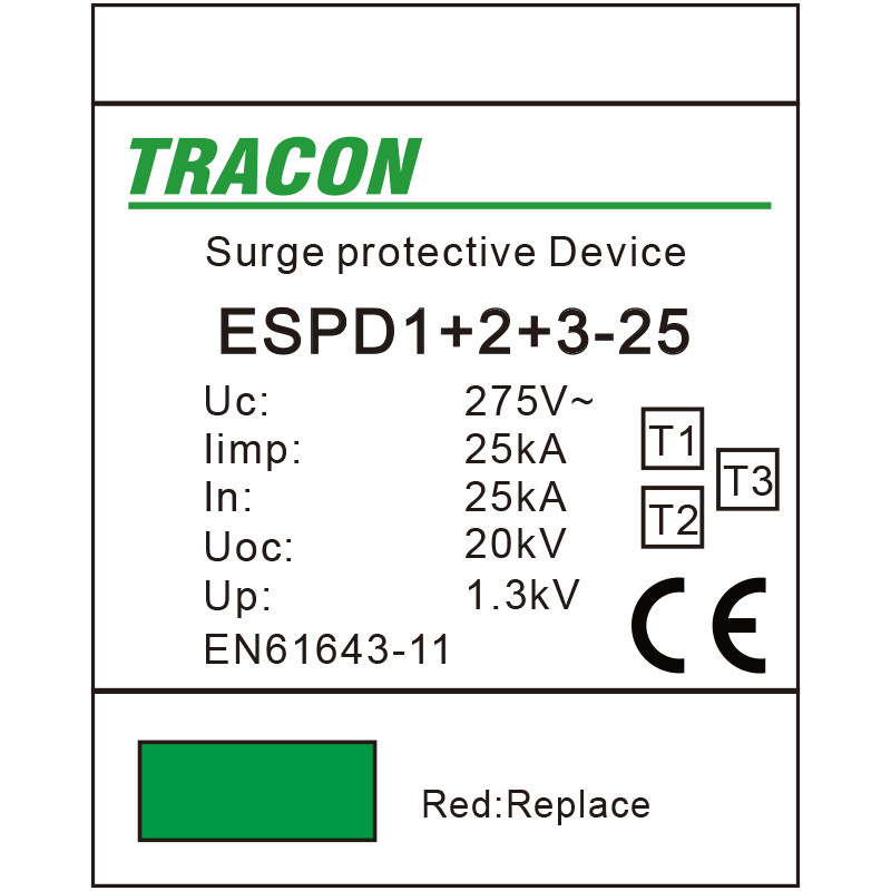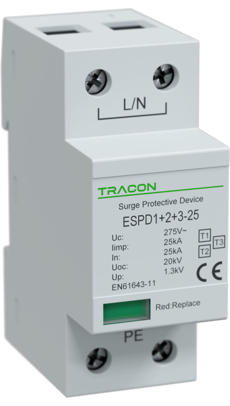 TRACON ESPD1+2+3-25-1P T1+T2+T3 AC típusú túlfeszültség levezető, egybeépített Uc:275V; Iimp:25kA; In:25kA; Uoc:20kV; Up:1,3kV; 1P