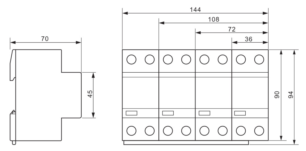 Védelmi szint < 4 kV, a beépítés szokásos helye: főelosztó - T2 típus: túlfeszültség-levezetők