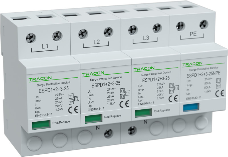 TRACON ESPD1+2+3-25-3+1P T1+T2+T3 AC típusú túlfeszültség levezető, egybeépített Uc:275V; Iimp:25/100kA; In:25/100kA; Uoc:20kV; Up:1,3kV; 1+3
