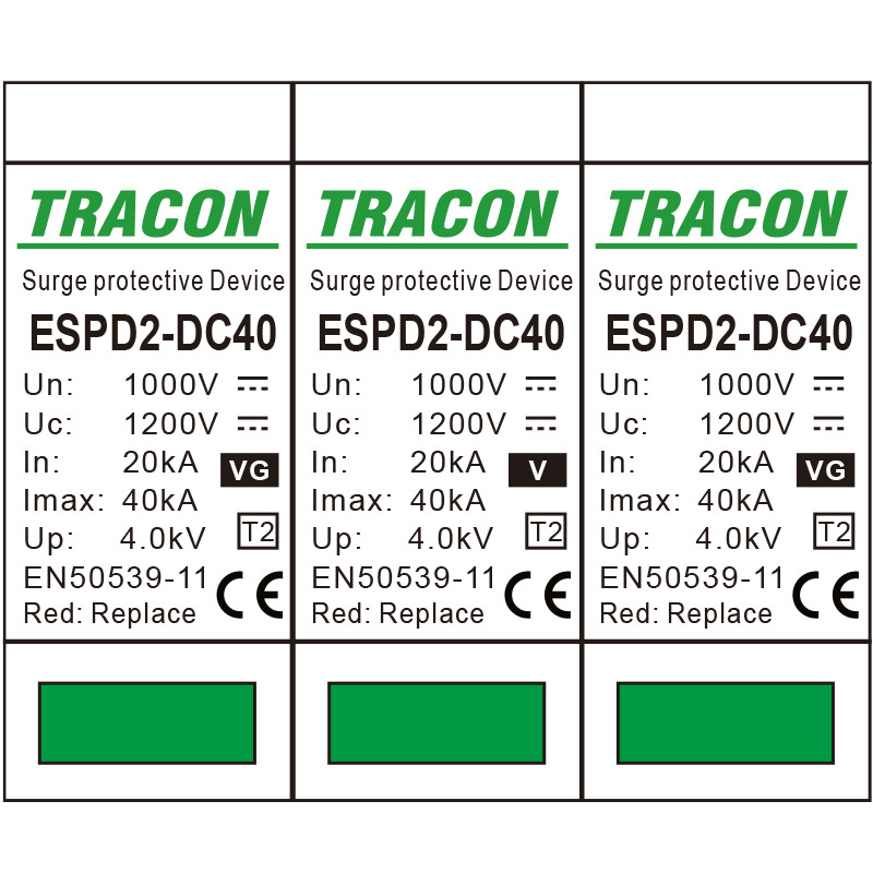 TRACON ESPD2-DC40-1000 T2 DC típusú túlfeszültség levezető, cserélhető betéttel Ucpv: 1200V; In:20kA; Imax:40kA; Up:4kV