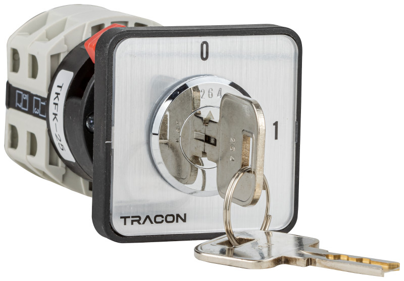 TRACON TKFK-25 Főkapcsoló, kulcsos, BE-KI (Kulcs 0-állásban vehető ki) 400V, 50Hz, 25A, 4P, 7,5kW, 48×48mm