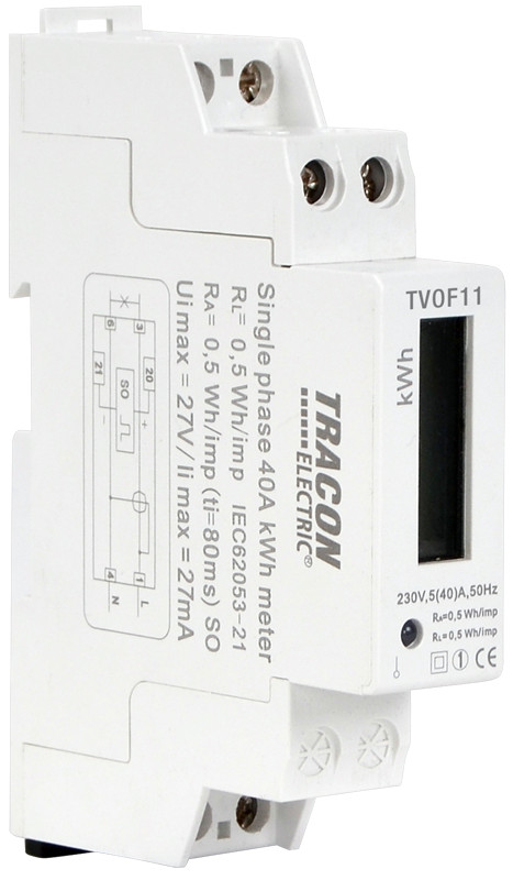 TRACON TVOF11 LCD kijelzésű fogyasztásmérő,közvetlen, 1 fázisú, 1 modul 230VAC / 5(40)A