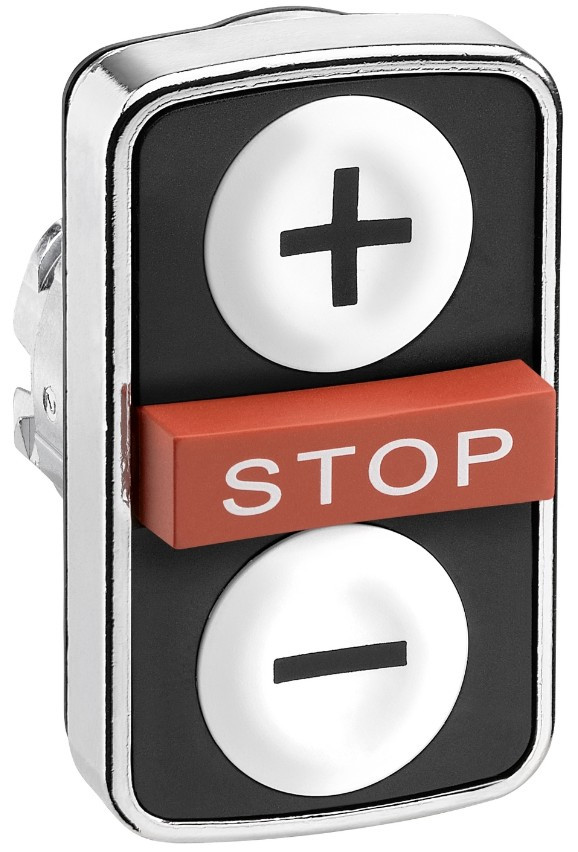 Harmony fém kettősfejű nyomógomb fej, Ø22, visszatérő, 1-1 fehér +/- nyomógomb, piros kiemelkedő STOP gomb