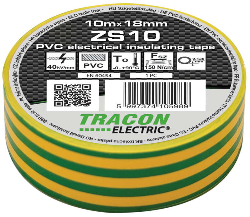TRACON ZS10 Szigetelőszalag, zöld/sárga 10m×18mm, PVC, 0-90°C, 40kV/mm