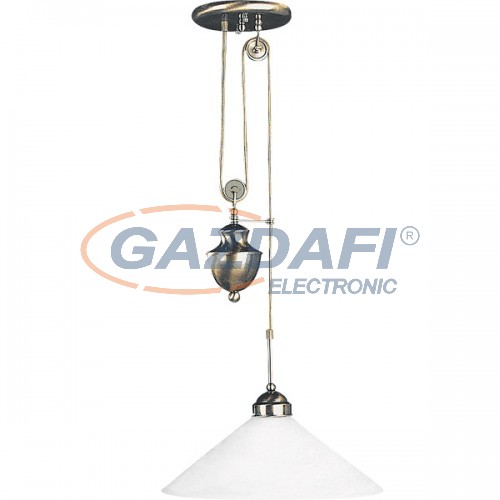Klasszikus megjelenésű függeszték 1 db foglalattal. Max. 185 cm lelógású, 39 cm átmérőjű, bronz színű fém test és fehér színű üveg lámpabúra. A lámpatest E27-es foglalatkialakítású, max. 100W teljesítményű fényforrással használható.