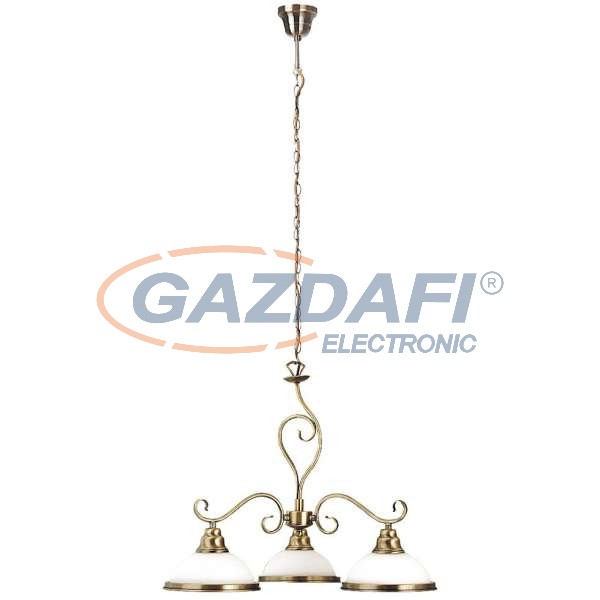 Klasszikus megjelenésű csillár 3 darab foglalattal. 64 cm széles, fix 100 cm lelógású, bronz színű fémből készített lámpatest és fehér színű üveg lámpabúrák. A lámpatest E27-es foglalatú, max. 3x 60W teljesítményű, halogén vagy energiatakarékos fényforrásokkal is használható.