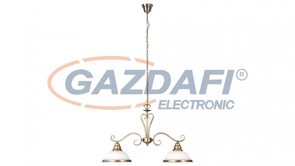 Klasszikus megjelenésű csillár 2 darab foglalattal. 62 cm átmérőjű, fix 116 cm lelógású, bronz színű fémből készített lámpatest és fehér színű üveg lámpabúrák. A lámpatest E27-es foglalatú, max. 2x 60W teljesítményű, halogén vagy energiatakarékos fényforrásokkal is használható.