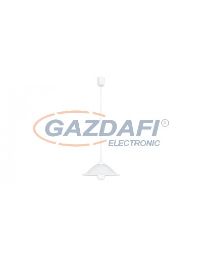 Időtlen megjelenésű függeszték 1 db foglalattal. 90 cm lelógású, 31 cm búraátmérőjű, fehér színű műanyag lámpatest és szintén fehér színű alabástromüveg lámpabúra. A lámpatest E27-es foglalatkialakítású, max. 60W teljesítményű energiatakarékos fényforrással is használható.