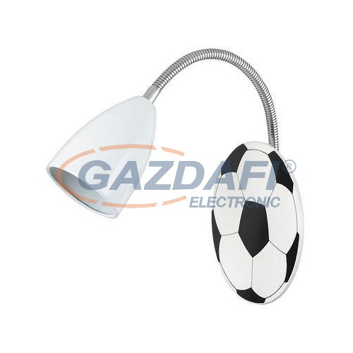 Egyedi megjelenésű fali gyerek lámpa 1 db foglalattal. 20 cm kinyúlású, 32 cm magas, fém és üveg kombinációjú szerkezet króm, fekete és fehér színben, futball mintával, IP20-as védettséggel. A lámpatest E-14-es foglalatkialakítású, max. 15W teljesítményű, kizárólag energiatakarékos izzóval használható.
