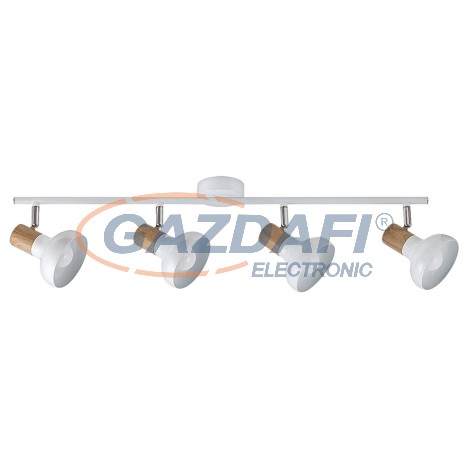 Skandináv stílusú mennyezeti spotlámpa 4 db foglalattal. 72 cm széles, fehér és bükk színkombinációjú fém lámpatest pozícionálható lámpabúrákkal, IP20-as védettséggel. A lámpatest E-14-es foglalatkialakítású, 4x max. 40W teljesítményű, energiatakarékos izzókkal is használható.
