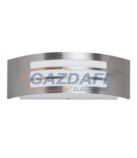 Modern megjelenésű kültéri fali lámpa, UV sugárzásnak ellenálló kivitelben, IP44-es, azaz fröccsenő víz elleni védelemmel. A 10 cm magas, 31,8 cm széles, íves formájú, rozsdamentes acél színű fém házból és műanyag lámpabúrából összeállított lámpatest E27-es foglalatú, max. 14W teljesítményű, energiatakarékos fényforrással használható. A modell hagyományos fényforrással nem üzemeltethető!