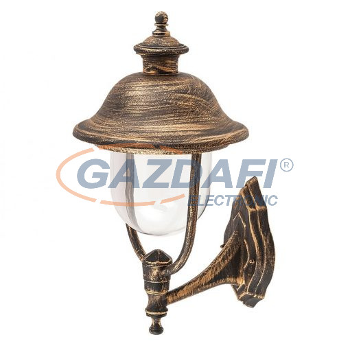 Klasszikus megjelenésű kültéri fali lámpa 1 db foglalattal, felfelé irányított búrával. 49,2 cm magas, 25,7 cm a faltól mért távolsága, antik arany színű fém lámpatest és műanyag lámpabúra, IP44-es, azaz fröccsenő víz és por elleni védelemmel. A lámpatest E27-es foglalatú, max. 100W teljesítményű fényforrással használható.