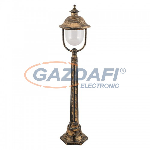 Klasszikus megjelenésű kültéri állólámpa 1 db foglalattal. 120 cm magas, 24,8 cm átmérőjű, antik arany színű fém lámpatest és műanyag lámpabúra, IP44-es, azaz fröccsenő víz és por elleni védelemmel. A lámpatest E27-es foglalatú, max. 100W teljesítményű fényforrással használható.