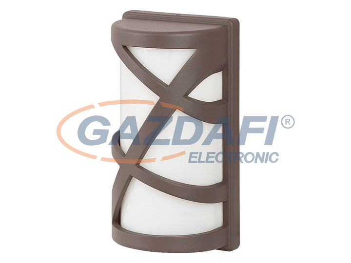 Modern megjelenésű kültéri fali lámpa, UV sugárzásnak ellenálló kivitelben, IP54-es, azaz por és fröccsenő víz elleni védelemmel. A 26,7 cm magas, 14,6 cm széles, barna színű fém házból és műanyag lámpabúrából összeállított lámpatest E27-es foglalatú, max. 40W teljesítményű fényforrással használható.