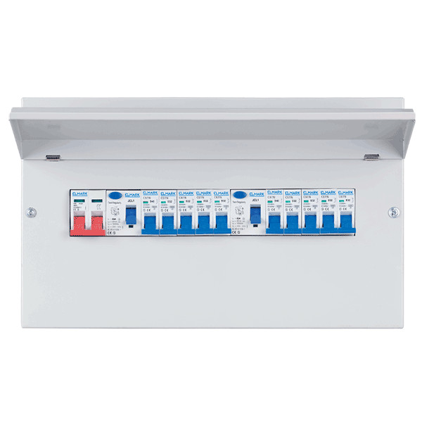 ELMARK fém elosztószekrény 10db kismegszakítóval, 2db Fi-relével, 1db 100A-s fkapcsolóval, 16 modul, 447x257x110mm
